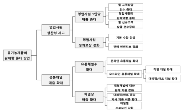 인과관계의 타당성 검증이란, 로직 트리의 각 박스를 잇고 있는 화살표들이 정말 타당한지를 검증하는 것입니다. 아래 그림에서 예를 들어 볼까요.유기농 제품의 판매량 증대 -> 영업 사원의 생산성재고라는 인과관계가 정말 타당한지 검증하는 것입니다. 유기농 제품의 판매량을 증대시키기 위해서 영업 사원의 생산성을 재고하는게 정말 타당한 인과관계인가?라고 자문해 보는 것이죠.