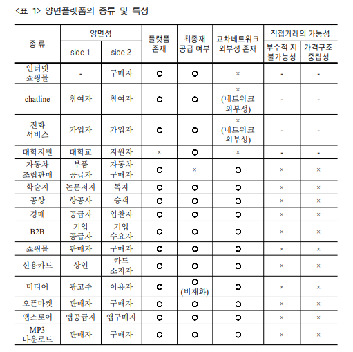 첫째 상호연결을 필요로 하는 둘 이상의 구분되는 고객 , 군(two distinct group) 이 존재하여야 한다 (양면성). , 둘째 한 면의 고객군은 다른 면의 고객군의 규모 가 클수록 더욱 높은 효용을 얻어야 한다 (교차 네트워크 외부성). , 셋째 높은 거래비용으로 인하여 서로 다른 고객군들이 자체적인 노력으로 직접 거래하는 것 이 불가능하기 때문에23), 즉 교차 네트워크 외부성을 내부화하는 것이 불가능하기 때문에 플랫폼을 이용하여야 거래가 성립된다 (플랫폼을 통한 외부성의 내부화).따라서 플랫폼은 거래비용을 최소화하면서 외부성을 해소하는 방안을 제 공하여 주는 실질적 가상적 공간 또는 제도적 장치로 생각할 수 있다.