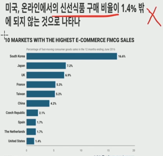 이는 한국의 특수성에 따르는데, 온라인 쇼핑이 가능한 충분한 인프라와 좁은 면적에 따른 물리적 유통업이 원활하고 발달했기 때문이라고 볼 수 있음.