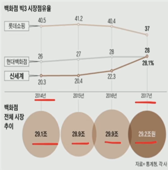 - 롯데쇼핑의 점유율 하락, 신세계가 롯데 쇼핑의 하락분 만큼 상승