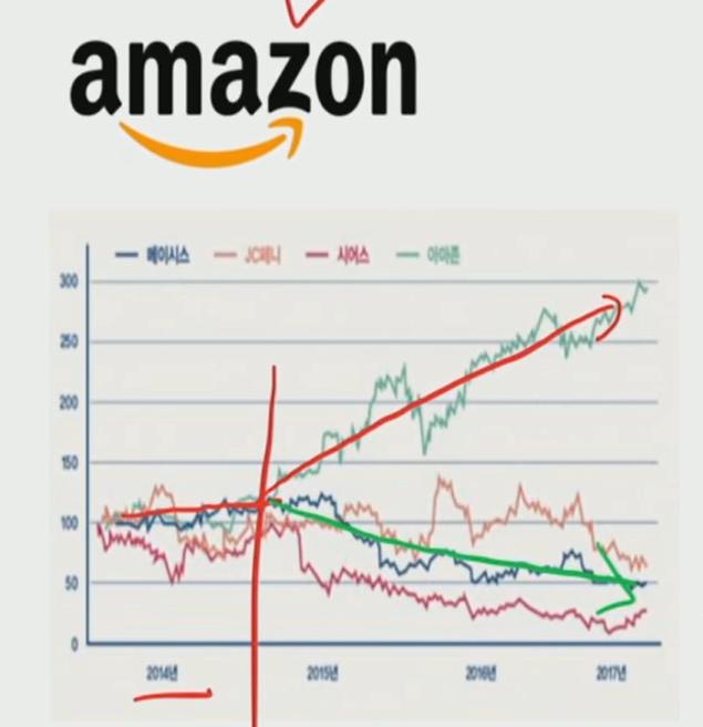 페이시스 JC 시어스와 같은 오프라인 매장의 매출은 감소추세. 반면 아마존은 대폭 상승추세