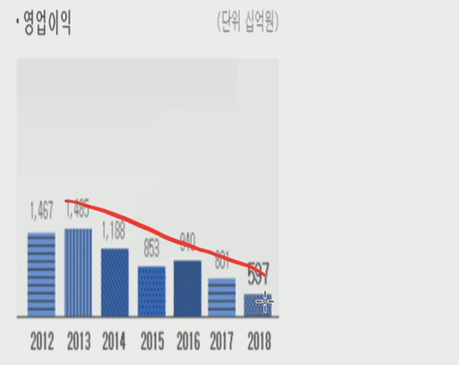 매출뿐만 아니라 영업이익도 감소추세다.