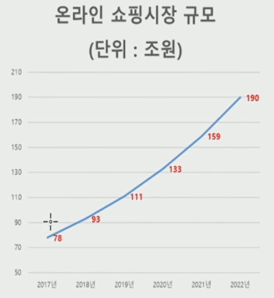시장을 오프라인 시장이 아닌 전체 유통시장으로 봤을때, 이를 양분하고 있는 것은 온라인 시장과 오프라인 시장인데, 온라인 시장이 급격히 성장하면서 오프라인 시장을 갉아먹고 있음.