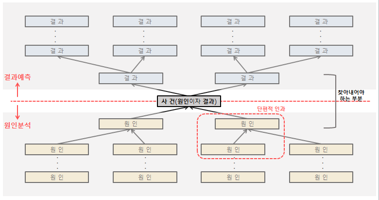 앞서 보여준, Why트리에서 세로축이 구조화의 양이라면, 인과관계의 심화는 가로축을 넓혀가는 것을 의미한다.