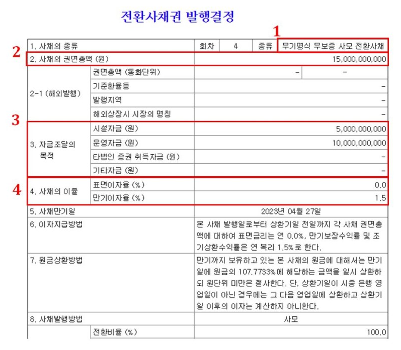 붉은 박스로 표시 해서 번호를 매겨 놓은 부분은 개인투자자들이 해당 공시가 뜨면 꼭 확인 해봐야 할 부분입니다. 그럼 레드박스를 중심으로 해당 공시를 하나씩 뜯어보겠습니다.