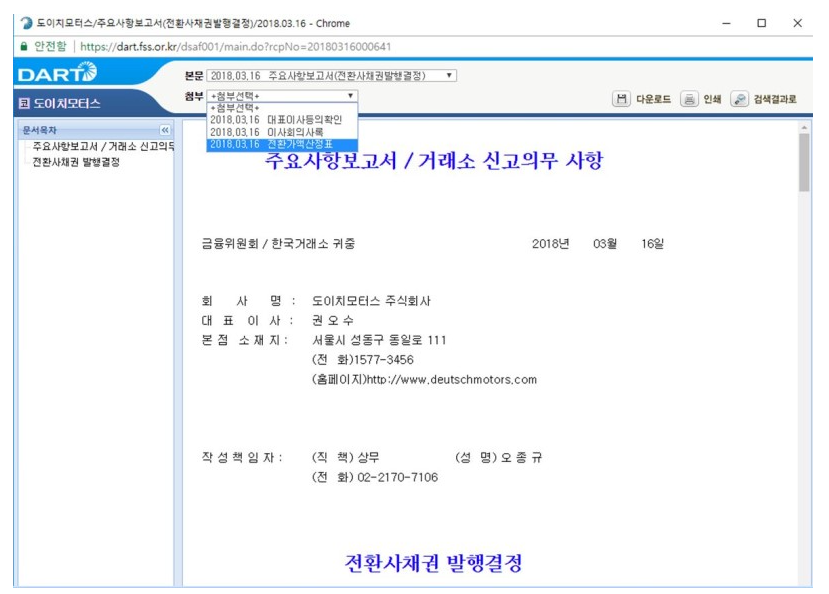 다트를 통해 공시를 본다면 이러한 화면을 보시게 되실 겁니다. 이 때 첨부선택을 클릭하면 여러 파일을 보실 수 있는데, 이 때 전환가액산정표를 같이 공시하고 있습니다. (같이 공시하지 않는 기업도 있습니다.) 이 부분을 클릭하면,