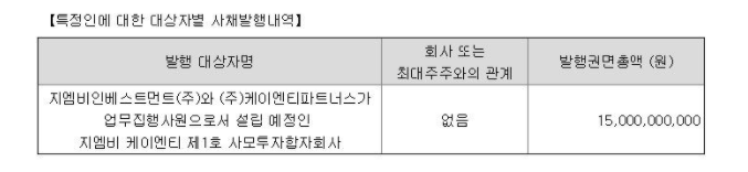 전환사채를 발행할 때 사모와 공모 두 가지가 있다고 말 했었습니다. 사모 발행을 할 경우 전환사채 대상자인 제 3자에 대한 정보는 공시의 가장 마지막에 표시되어져 있습니다.
