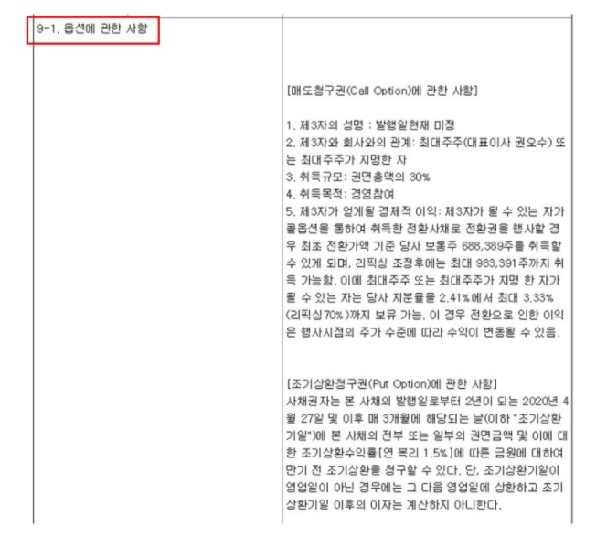 공시를 보다보면 이렇듯이 옵션에 관한 사항이 나옵니다. 옵션이 붙어 있는 사채라면 이러한 항목이 있을 것이고 옵션이 없다면 이러한 항목도 없을 것입니다. 위 도이치모터스(주)가 발행한 전환사채의 경우에는 매도청구권과 조기상환청구권이 모두 붙은 경우입니다. 매도청구권은 call option으로 발행한 기업이 행사할 수 있는 옵션입니다. 간단하게 기업이 전환일이나 만기일이 되기 전에 투자자에게 상환을 할 수 있는 권리입니다. 이러한 옵션이 붙은 경우 투자자는 만기까지 가지고 있고 싶어도 기업에서 call option을 행사하겠다고 했을 때 상환을 받아야 하는 것입니다.