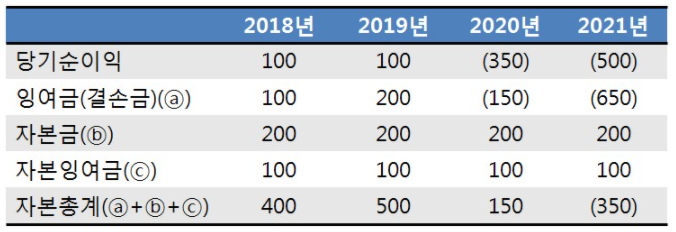 기업 A는 350원의 당기순손실이 발생하여 2019년까지 적립한 잉여금 200원을 모두 까먹었고 추가로 150원의 결손금이 발생