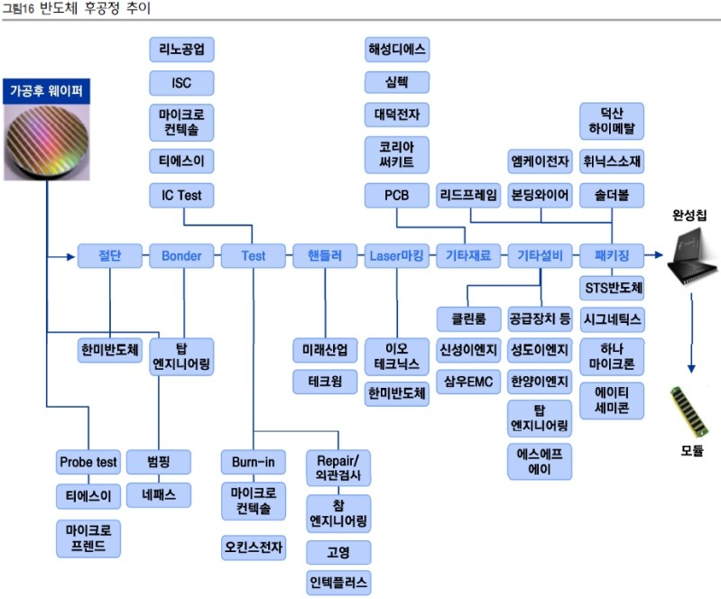 와이어본딩(Wire bonding): 칩 마운트 공정에서 기판 위에 올려진 다이의 접점과 기판의 접점을 가는 금선을 사용해 연결하는 공정이다. 한편 빠른 속도를 필요로 하는 반도체칩의 경우에는 전선에서 일어나는 신호 지연 현상을 줄이기 위해 전선 대신 다시 표면에 직접 전극이 되는 범프(Bump, 돌기)를 형성하고 시판에 직접 실장한다. 이러한 패키징 방식을 ‘플립 칩(flip chip)’이라고 한다. 플립 칩은 다이(die) 표면에 솔더 볼 등의 범프를 형성하고 패드 부분이 기판과 마주보게 한 후 직접 융착하는 방식이다. 신호처리가 빠르고 접점도 여러 개 만들 수 있다는 장점이 있다.참고로 2016년 출시된 아이폰7의 칩패키징을 담당한 TSMC는 FoWLP(Fan-outwafer level packaging)라는 첨단 패키징 기술을 도입했다. 팬아웃은 웨이퍼에 형성하는 범프(bump), 즉 입출력(I/O) 단자를 칩 안과 바깥쪽 모두에 배치시키는 기술이다.성형(Molding)/ Laser마킹/패키징: 성형(Molding)은 반도체를 밀봉하는 과정이다. 즉,연결부위 보호를 위해 화학수지로 밀봉한다. 그 이후 제품명 등을 새기면(Laser Marking) 하나의 반도체 단품 칩이 완성된다.IC Test Socket: IC Test 소켓은 반도체 후공정 패키징 단계에서 전기적 신호로 불량여부 테스트한다. IC test 소켓의 생산 방식은 크게 Pin type과 Silicon type이 있으며 대표적인 기업으로는 Pin type에 리노공업이 있고 Silicon type에는 ISC가 있다. BurninSocket을 생산하는 마이크로컨텍솔과 NAND Probe Card를 생산하는 티에스이도 Silicon type test 소켓 시장으로 진출했다. Pin type은 R&D, 비메모리 등에 강점이 있고, Silicon type은 메모리, 대량생산을 진행하는 Chip에 강점이 있다.Burn-In Test Socket: 번인테스트는 스트레스 테스트(가혹한 환경에서 Test)로서 컴퓨터,모바일 등의 장시간 가동시 발생하는 열적 조건을 조성하여 보통 섭씨 125도 정도의 온도조건에서 4 ~ 48시간 동안 Cell에 Data를 쓰고 지우며 각각 Cell의 동작여부를 검사하는 것이다. 번인테스트의 경우 메모리 반도체를 중심으로 적용되고 있다.