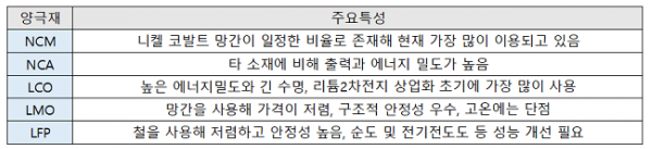 통상 양극재는 5가지 정도가 있다. 니켈(Ni), 코발트(Co), 망간(Mn), 알루미늄(Al) 등을 조합해 만드는데 NCM(니켈코발트망간), NCA(니켈코발트알루미늄), LMO(리튬망간산화물), LCO(리튬코발트산화물), LFP(리튬인산철)이 대표적인 양극재로 꼽힌다.