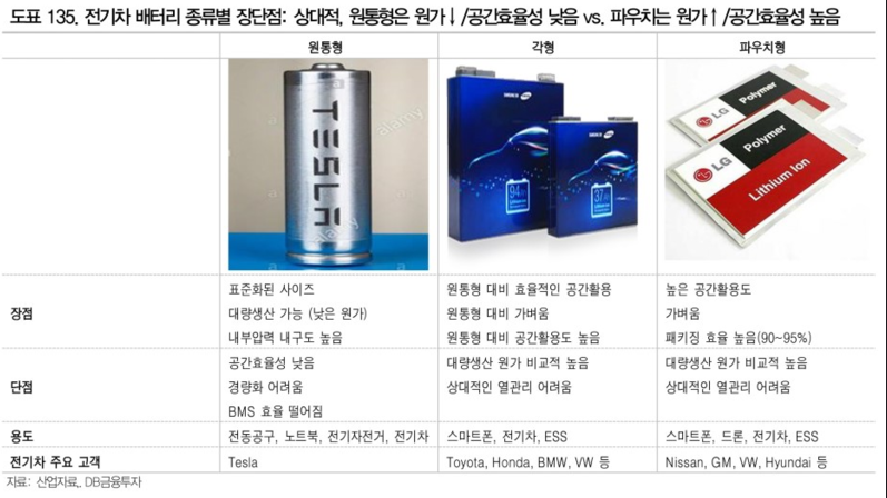 원통형, 파우치형, 각형베터리의 개념, 장단점: LINK