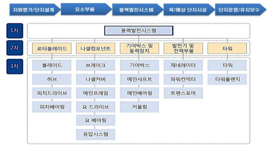 너셀 (Nacelle):수평축 풍력발전기에서 발전기가 받는 공기의 흐름(바람)을 조정하기 위한 일종의 덮개로 타워의 상부에 동력 전달 장치와 그 밖의 장치를 내장한 곳.증속기 (Gearbox): 날개에서 발생한 회전력을 발전기에서 요구되는 회전수로 변속하여 발전기로 회전시키는 장치.블레이드 (Blade): 바람에너지를 기계적 에너지(운동에너지)로 변환시키는 장치로서 풍력발전시스템의 용량과 제어방식을 결정하는 중요한 장치.허브 (Hub): 날개 또는 날개 조립부품을 로터축에 설치하는 고정부품을 말하며, 풍력발전기 허브높이는 지표면으로부터 풍력기기 로터의 중심가지의 높이를 말함.타워 (Tower): 풍력발전기를 지탱해주는 구조물.브레이크 (Brake): 로터를 감속시키거나 회전을 정지시킬 수 있는 장치.Geared, Gearless: 증속기의 유무에 따라 기어드형(Geared type)과 기어리스형(Gearless type)으로 나누어짐. 기어드형은 정속형, 기어리스형은 가변형 풍력발전기로 기어리스형은 증속기를 거치지 않고 발전기에 바로 연결하여 운전하므로 Direct Drive라고도 함.발전기 (Generator): 전달된 회전력(운동에너지)를 전기에너지로 전환하는 장치회전자 (Rotor): 블레이드와 연결되어 회전력을 회전축으로 전달시키는 장치.회전축 (Shaft): 블레이드 및 로터에서 전달된 회전력을 증속기로 전달하는 장치.