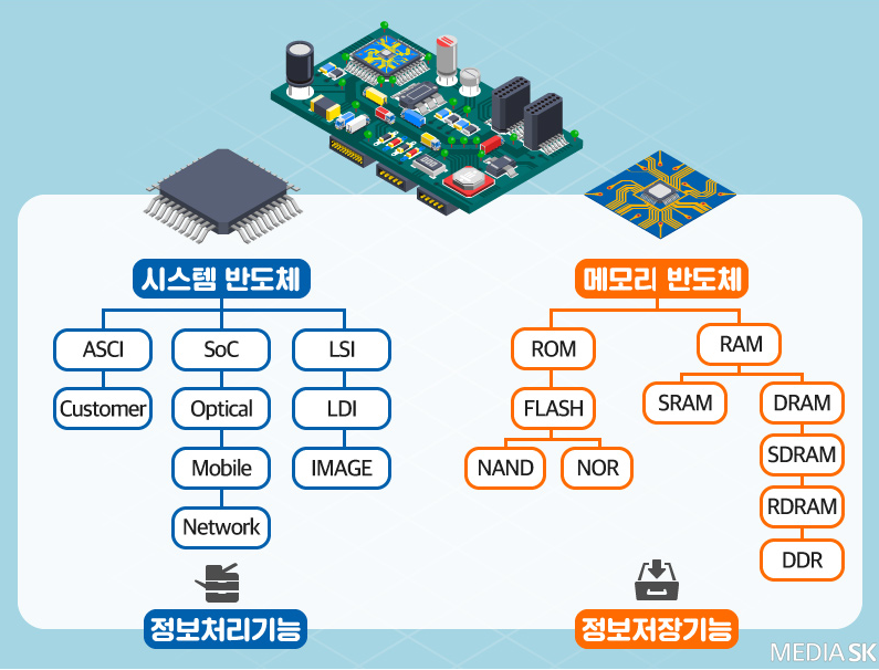 메모리 반도체: 메모리반도체는 데이터를 저장하는 역할(https://news.joins.com/article/13058344). 중앙처리장치(CPU)나 스마트폰에 들어가는 애플리케이션프로세서(AP), 디지털 사진기에 들어가는 이미지센서 등 종류가 다양. 전세계 반도체시장의 30%가 메모리반도체, 70%가 비메모리 반도체. 아이폰에 들어가는 21개의 반도체중 18개가 시스템반도체, 3개가 메모리 반도체. (https://news.joins.com/article/13058344) 비메모리 반도체는 설계가 복잡해 기술적 진입장벽이 높다. 미국회사들의 대부분의 점유율 차지.(LINK)비메모리 반도체(시스템 반도체): 시스템반도체는 연산·제어 등의 정보처리 기능rom: 쉽게 말하면 컴퓨터의 하드. 기억이 길고 속도가 느리다ram:컴퓨터의 메모리. 기억이 짧지만 속도가 빠르다.