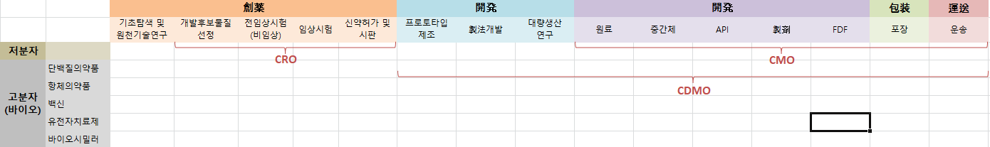 CMO: CMO(Contract Manufacturing Organization)CDMO: 제약업계의 새로운 트렌드로 CDMO(위탁개발생산) 사업이 떠오르고 있다. 에스티팜이 CDMO 사업에 처음 뛰어든 뒤 최근에는 삼성바이오, 셀트리온에 이어 SK와 같은 대기업까지 이 사업에 눈독을 들이고 있다. 특히 CDMO 사업은 연평균 10% 이상의 성장률이 예상되며 전세계 제약산업에서 새로운 블루오션 영역으로 주목을 받고 있다. CDMO는 기존 위탁생산을 뜻하는 CMO에 ‘개발’을 더한 개념이다CDMO시장의 세분화: API, Intermediates, FDF, Package