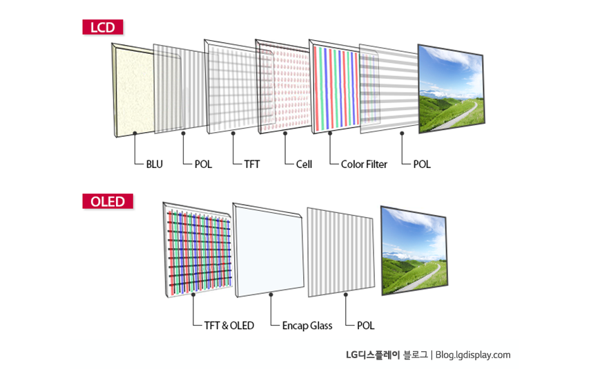 OLED, LCD: OLED은 편광판의 숫자가 전면에 하나만 붙고, LCD는 액정 전 후면에 각각 하나씩 붙어 두 개입니다. 이런 차이는 서로 다른 발광원리에서 찾을 수 있는데요. LCD는 빛을 투과해서 내는 투과형으로 백라이트가 빛을 내주어 필요한 양만큼 빛을 통과시킵니다. 하지만 OLED는 소자 하나하나가 빛을 내는 발광형으로, 각 소자에 흐르는 전류를 달리 주어 빛을 조절할 수 있기 때문에 백라이트가 필요없지요.LINK