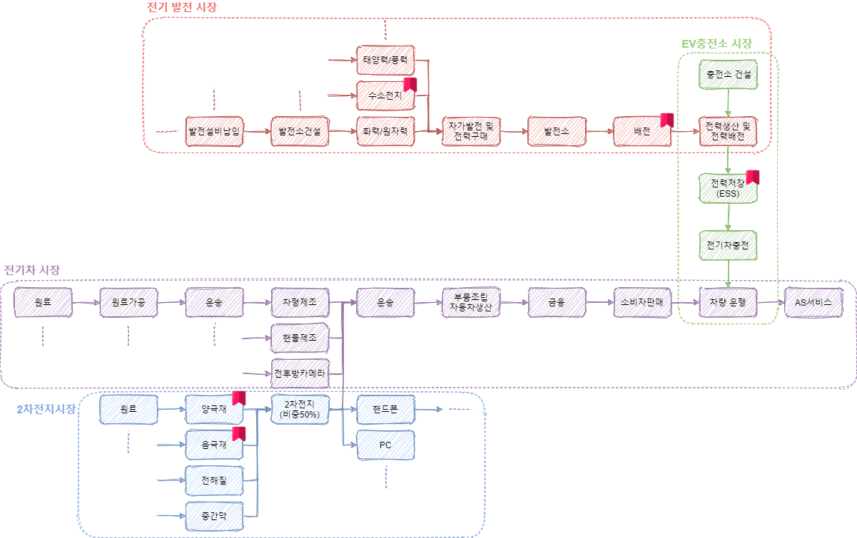 아래는 위와 같은 수직적 밸류체인 분석을 통해 전기차 생태계를 분석한 것이다.