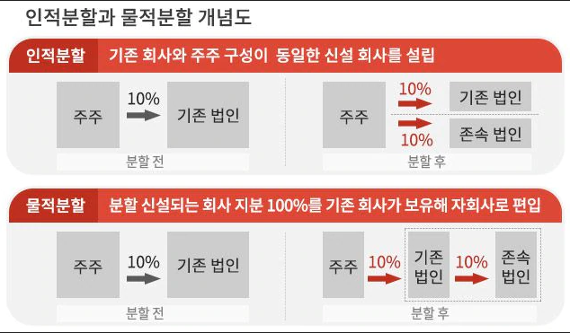 기업분할 방식은 크게 두 가지로 나뉩니다. 분할되는 기업의 주식을 원래 존재했던 회사(모기업)가 100% 보유할 경우 이를 물적분할이라고 합니다. 반면 분할되는 기업의 주식을 모기업 주주들이 일정 비율로 분배하면 이를 인적분할로 부릅니다.
