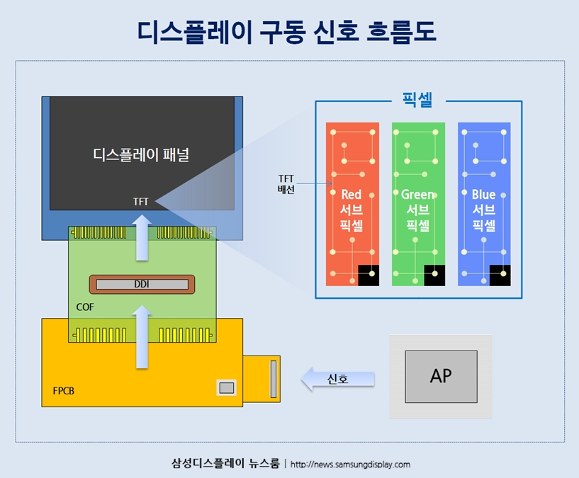 디스플레이의 픽셀은 빛의 삼원색인 RGB(Red, Green, Blue)를 표시하는 서브픽셀로 구성되어 있고, 이러한 서브픽셀을 직접 제어하는 것이 TFT(박막트랜지스터)입니다. 그리고 TFT에 신호를 전달해서 최종적으로 픽셀을 제어하는 역할을 하는 것이 DDI입니다. DDI는 AP와 패널 사이에서 신호의 통로 역할을 하며 다채로운 영상 정보를 화면에 보여줄 수 있는 중요한 기능을 합니다.