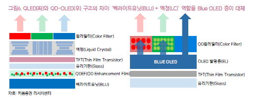QD-OLED의 기본 개념: Blue OLED 발광원과 Red, Green QD 컬러필터의 만남. QD-OLED 패널은 삼성디스플레이가 대형 사업부에서 LCD 패널 이후 양산 준비 중에 있는 차세대 QD기술로, QD가 QLED에서와 달리 보조재로의 역할이 아닌 실제적으로 색을 구현하는 중요한 역할을 수행한다. 그림 6에서 볼 수 있듯이 QLED 패널에서 백라이트 유닛(BLU)과 액정(Liquid Crystal)이 수행하는 발광체로의 역할을 Blue OLED층이 대신한다. 컬러필터에는 R, G, B PR 대신 R, G QD를 잉크젯방식으로 증착한다. 즉 R, G, B 삼원광 중 R, G는 QD를 통해, B는 OLED를 통해 구현하는 방식이다.