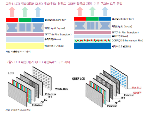 QLED는 Quantum dot LED의 약자로 기존 LCD에 QD 필름을 추가한 구조: QD는 보조재로의 역할 수행