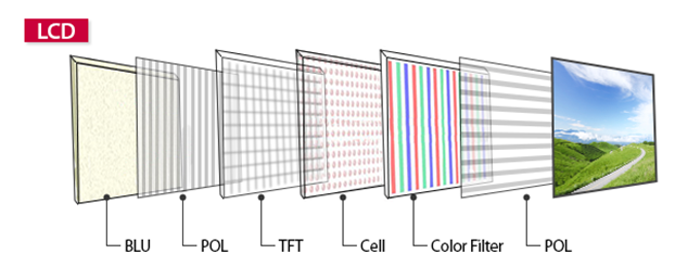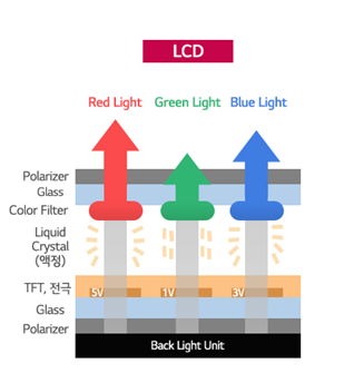 LCD는 빛을 투과해서 내는 투과형으로 백라이트가 빛을 내주어 필요한 양만큼 빛을 통과.백라이트 -> 편광판1 -> 액정 -> 편광판2 -> 컬러필터.. 의 과정을거침