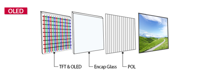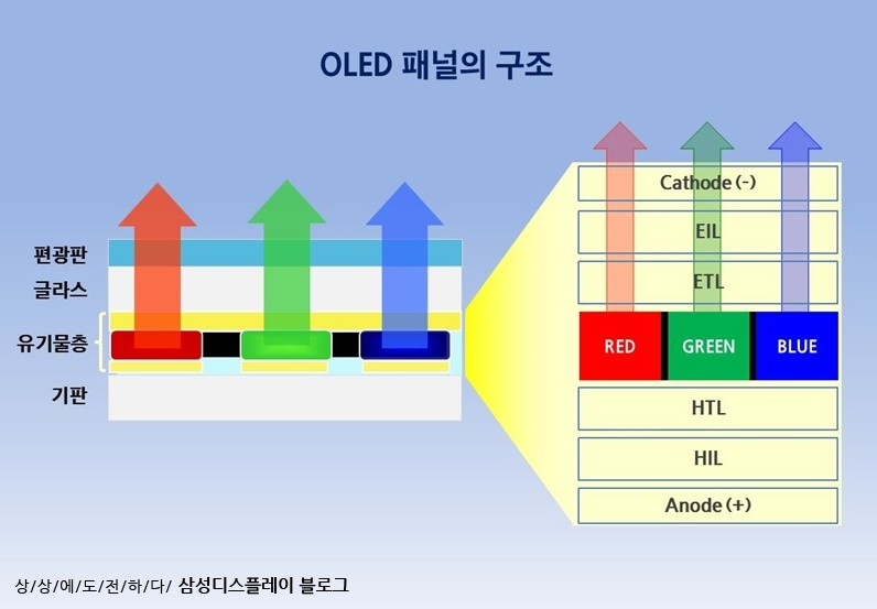 EML 즉, 발광층은 어떠한 색을 내는지에 따라 서로 다른 발광물질(재료)가 사용됨. 기본적으로 빛의 3원색인 적색/녹색/청색(RGB)의 색을 내는 물질이 사용됨. 이러한 방식으로 각 색상별로 여러 층으로 구성된 OLED 소자의 덩어리를 OLED 패널에서 ‘유기물층’이라고 부릅니다. 그리고 아래와 같이 전체적인 패널의 모습을 갖추게 됨. 따라서, 컬러패널도 필요없음.