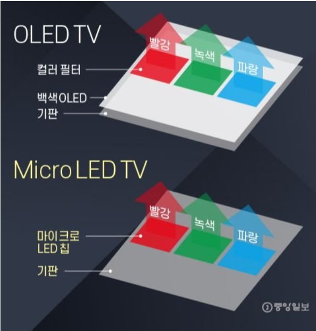 삼성의 마이크로 LED TV는 컬러필터가 없다. 적·녹·청 LED가 스스로 빛을 내기 때문이다. 특히 삼성은 LED마다 칩을 더해 각각의 적·녹·청 소자를 개별 제어하는 구조를 택했다. 색 재현력을 보다 정확하게 하기 위해서다. 마이크로 LED TV는 색 재현력이 이전에 봤던 어떤 TV보다도 선명하고 밝았다. 삼성전자는 "마이크로 LED TV는 스스로 빛과 색을 내는 첫 TV"라고 강조했다. LG의 OLED TV는 스스로 빛만 낸다는 점을 겨냥한 대목이다.