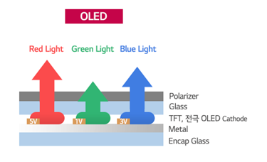 OLED에서 TFT의 역할은 유기물에 가하는 전압을 조정하여 빛의 양을 조절. 가해지는 전압에 따라 빛의 양이 다르기 때문에 액정이 필요없음