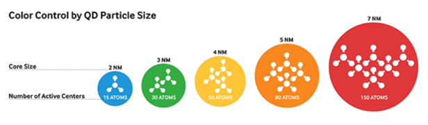 QD(Quantum Dot, 퀀텀닷): 인듐, 카드뮴과 같은 무기물로서 자체적으로 빛을 내는 지름 수 나노미터 이하의 입자. 퀀텀닷은 재료를 >바꾸지 않고 입자 크기를 조절하는 것 만으로도 원하는 색을 얻을 수 있음. 양자구속 효과에 따라 입자 크기가 작을수록(파장이 짧을수록) 청색 빛, 클수록(파장이 길수록) 적색 빛을 냄