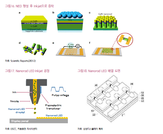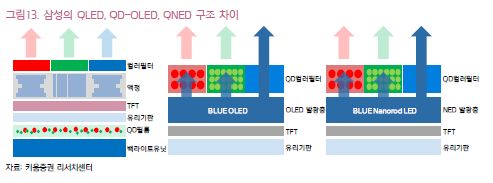 공급사와 수요처 모두에게 win win 이 될 수 있는 혜안. 삼성디스플레이의 QNED 개발 가능성은 지난해 말부터 대두되기 시작했다 2 년 이상 QD OLED 개발에 힘을 쏟고 있던 것으로 알려진 삼성디스플레이 가 갑작스 럽게 QNED 기술 을 개발 하고 있다고 공개된 것은 의아하지 않을 수 없다 상대적으로 R OI 가 낮은 패널 업체 입장에서는 제한된 자원을 분산시키는 리스크를 감안하면서 까지 개발 라인을 다양하게 가져가는 근거가 있을 것 으로 보인다.QNED는 QD OLED 와 레이아웃이 유사하며 발광원만 Blue OLED 가 아닌 Blue Nanorod LED (이하NED) 로 변경되었다는 점이 그 특징이다 Blue OLED 의 제한적인 수명 및 발광 효율 이슈 가 있고 유기물 소재를 대형 패널에 Open mask 방식으로 증착 Evaporation) 하는 것 또한 어려움이 있다. 앞서 QD 소재에 대해 소개하며 유기물과 무기물 차이에 대해 설명 한 바가 있는데 NE D 또한 무기물을 기반으로 한다 무기물은 탄소를 포함하지 않아 쉽게 2 차 반응이 일어나지 않고 안정적이라는 특징이 있다 5~7 년에 달하는 TV 수명을 고려 한다면 소비자 입장에서는 번인 현상 등에 취약한 OLED 기반의 TV 보다는 NED 기반의 TV 품질 을 선호할 것으로 예상된 다 공급 업체 입장에서는 패널 공정 중 가장 어렵 고 높은 비용을 요구하는 것으로 알려진 OLED 증착 Evaporation) 공정을 NED Inkjet 증착으로 대체하고 상대적으로 가격이 저렴한 NED 를 사용함으로써 원가 비용 절감 효과가 기대된다