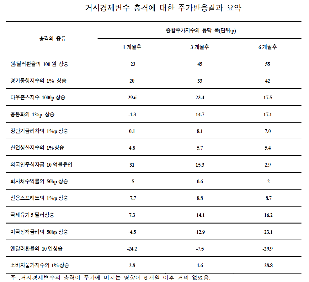 대내외 거시경제변수들의 변화 충격이 발생했을 때 주가의 반응크기를 살펴보면 원/달러환율, 미국주가의 변화, 통화량, 장단기 금리차 순으로 주가에 영향을 주는 정도가 큰 것으로 나타났음.