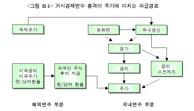 주가에 영향을 주는 거시경제변수들을 국내부문(실물부문과 금융부문), 해외부문으로 나누어 보면 다음과 같음.