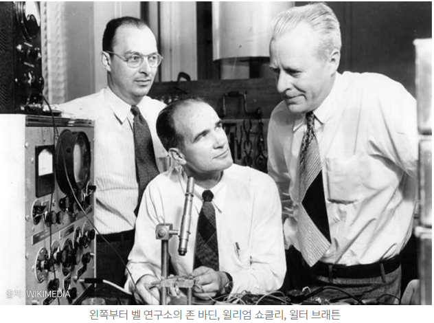 1947년, 미국 최대 전화 통신 회사 AT&T(American Telephone & Telegraph)의 중앙연구소인 벨 연구소 연구원들은 반도체 격자구조의 조각에 도체선(전기가 흐르는데 사용되는 선)을 접촉시키면 전기 신호가 증폭한다는 사실을 발견합니다.