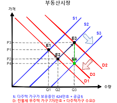 정부는 수요측면에서 다주택가구의 수요D를 최대한 억제하고, 공급측면에서 공급S를 늘이며 다주택가구의 보유 주택을 시장에 최대한 내놓게 하는 각종 정책을 시행함으로써, E1(현상태)에서 E2로 균형점을 이동시키고 가격을 P1 ➡ P2로 안정화시킬 계획이었다.