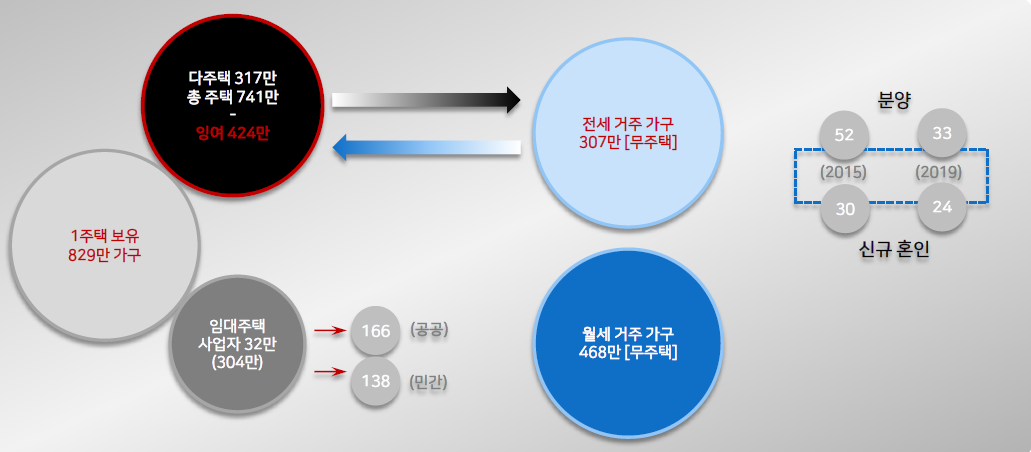 수요와 공급을 다음과 같이 산정할 수 있다. 1주택 보유가구는 1개의 주택만가지고 평화롭게 사는 세그먼트이므로 부동산시장의 수요와 공급에 포함되지 않음을 전제한다.