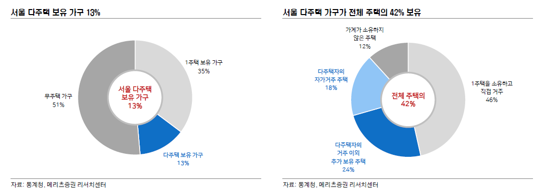 서울의 다주택 보유가구는 전체가구 중 13%에 지나지 않는다. 하지만, 이 13%가 전체 주택의 42%를 소유하고 있는 중이다. 즉, 한 사람이 거주목적 이외의 타목적으로 여러채의 주택을 소유하게 되니, 한 가구당 한 채의 집이 분배되지 않는 것이다. 다주택가구는 부동산 시장 교란의 가장 큰 원인 변수다.