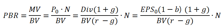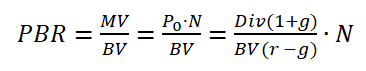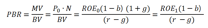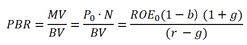 PBR의 식은 다음과 같이 나타낼 수 있습니다. 주가 P0에 고든 서장 모형을 대입한 식입니다. MV는 MarketValue(시총)을 BV는 BookValue(자기자본)을 의미합니다.