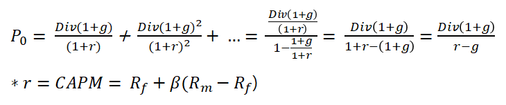 현재 주가는 배당의 미래(무한미래) 가치를 현재가치로 할인한 금액의 합과 같습니다. 무한 등비수열을 이용하면 쉽게 도출되는 식입니다. 이때 할인률 (1+r)에 사용된 r은 CAPM의 값으로써, 주주기대이익률입니다. CAPM에 관한 자세한 내용은 생략하겠습니다. 다음 링크에서 CAPM에 관한 자세한 내용을 확인해주세요.