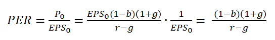 PER은 주가/EPS이므로, 주가의 부분에 위에서 도출했던 고든 성장 모형을 대입해주면 위와 같은 식이 됩니다.