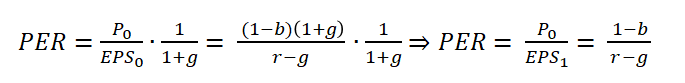 이때, EPS0보다 EPS1이 PER을 더 잘나타낸다는 이론에 의해, 양변을 (1+g)로 나누면 좌변의 EPS는 0기 시점의 EPS0가 아닌 1기 시점의 EPS1으로 표현할 수 있습니다. 식이 깔끔해 졌네요.