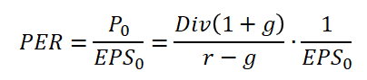 자, 이제 고든 성장 모형에서 PER의 변수를 뽑아내는 작업을 해보겠습니다. 먼저 그 시작점은 아래와 같은 PER 수식 입니다.