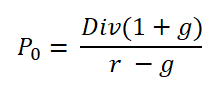 고든 성장모형은 아래와 같은 식입니다. 쉽게 말하면, 미래의 배당가치를 현재가치로 할인한 가치가 곧 주가이다라는 의미가 됩니다. 할인에 대한 개념을 갖고 있는 분이라면 쉽게 이해가 가겠지만, 그렇지 않은 분들을 위해 고든 성장 모형의 산출법을 기재해두겠습니다.