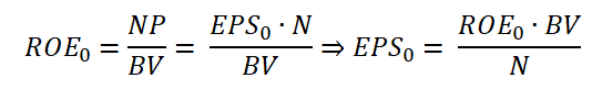 ROE는 당기순이익/자기자본 입니다. 당기순이익은 EPS*N으로 나타낼 수 있습니다. 그렇게 얻은 ROE에 관하여 정리된 식을 EPS를 좌변으로 이항시켜 EPS에 관해 정리하면 위와 같은 결과를 얻을 수 있습니다.