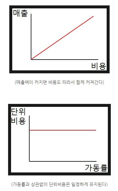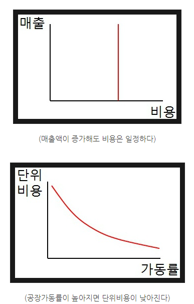 - 설비 가동율이 상승할 수록 단위비용은 일정하다.