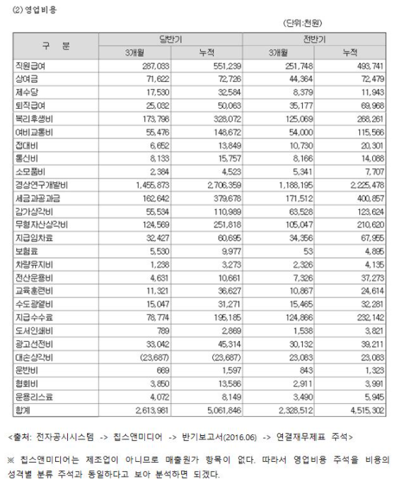 다음은 칩스앤미디어의 영업비용 주석이다.
