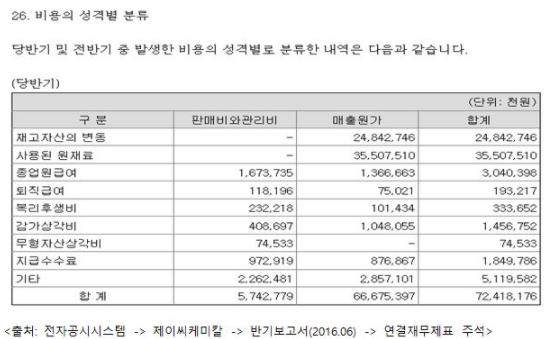 다음은 제이씨케미칼의 비용의 성격별 분류 주석이다.