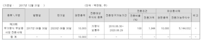 이 회사는 지난해 6월 30일 '무기명식 무보증 사모 전환사채(CB)' 100억원을 발행했다. 전환가액은 1944원, 전환청구가능기간은 2020년 6월 29일까지이고, 전환가능주식수는 514만주였다.