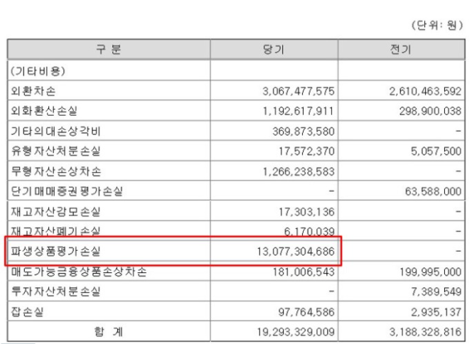 가장 큰 이유는 이 회사의 주가가 상승하면서 지난해 6월 발행한 전환사채(CB)에서 파생상품평가손실 130억원이 발생했기 때문이다. CB 파생상품평가손익이란 기업이 발행한 CB가 주식으로 전환되지 않고 남아있을 경우, 연말에 공정가치로 평가해서 평가손익을 기재하는 것을 말한다.