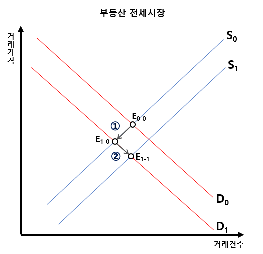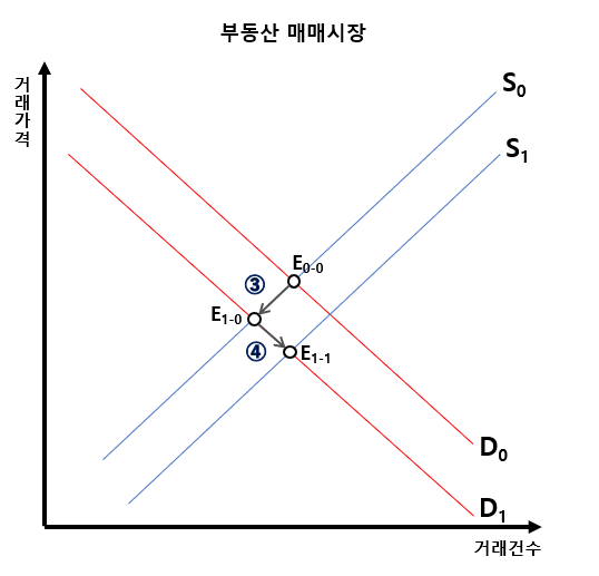 이에 따라, 새로운 균형점 E3가 형성되며 거래 가격은 하락하고, 거래 건수는 상승하는 결과